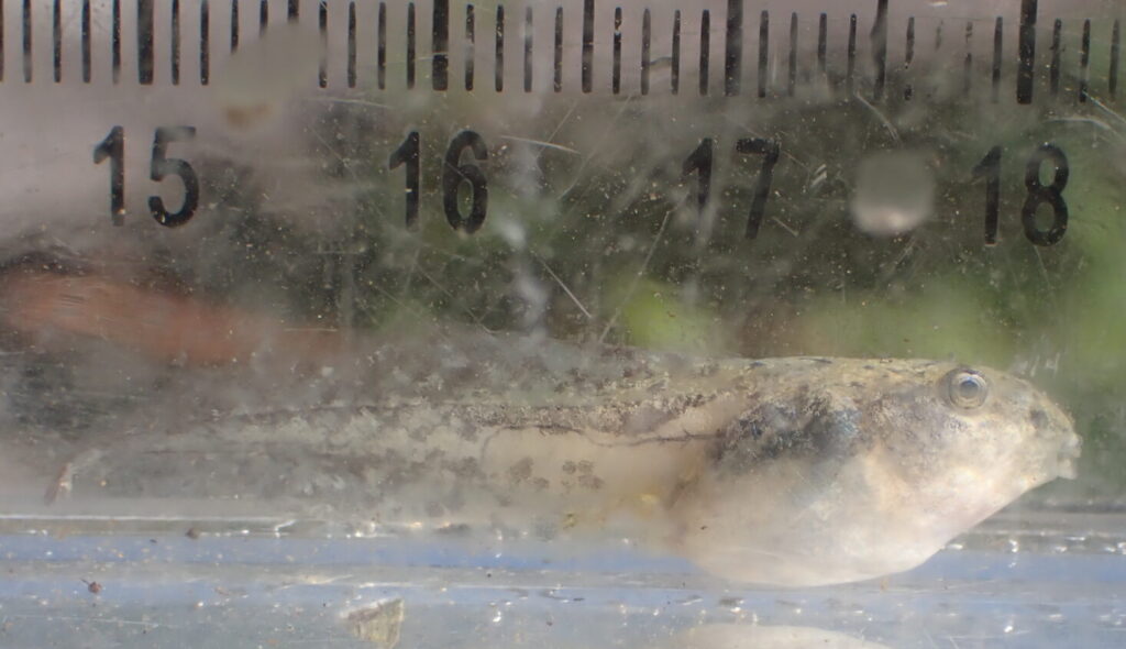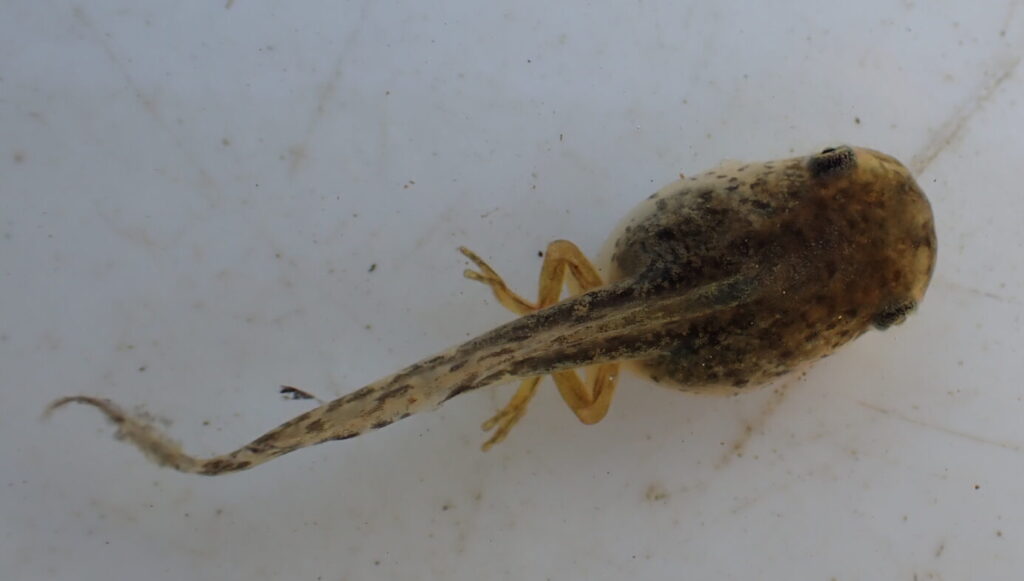 少し見えにくいですが、左がヌマガエル、右がニホンアマガエルのおたまじゃくしです。どちらも尾に黒い網目状の斑点模様がはっきりとあるのが特徴です。ニホンアマガエルの尾が目の上あたりから伸びているように見えると思いますが、これがこの2種の分かりやすい違いです。
