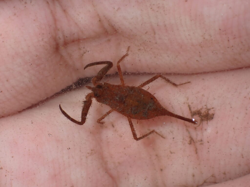 平たい体と長い尾(呼吸管)、鎌状の前脚が特徴の、水生のカメムシです。タガメと間違われることがありますが、体は4センチほどでタガメよりも小さく(タガメでは5センチ以上)、また長い呼吸管があることで区別は簡単です(ただしこの呼吸管が切れてしまっている個体もまれにいます)。