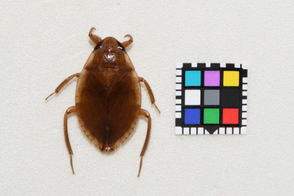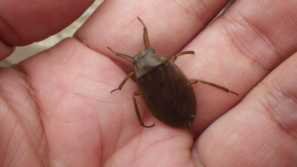 コオイムシは2cmほどで、筑後川流域では比較的普通にみられますがカメムシの仲間であるため、農薬に弱くすぐいなくなってしまいます。主に平地の水田や水路、ため池に生息しています。前脚は鎌状で、ヤゴなどの小昆虫を捕獲して、口を刺し込み消化酵素を流し込んで肉を溶かして食べます。