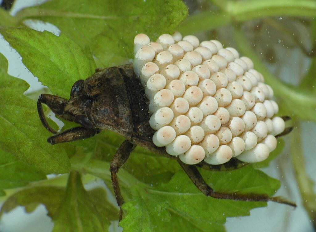 オスが卵を背負って守る生態を持つことからコオイムシ(子負い虫)の名がついています。メスはオスの背中に卵を産み付け、オスがその後、孵化するまで卵を守ります。このような生態は、海水魚のタツノオトシゴ類などでも見られますね。水生昆虫の王者・タガメは木や植物に産み付けられた卵をオスが守りますが、実はタガメはコオイムシと同じコオイムシ科に属します。コオイムシ科はいずれも何らかの形で、オスが卵を守る生態を持っています。