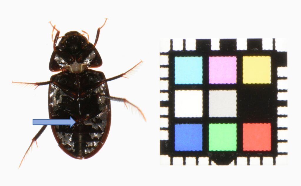 ミナミヒメガムシ、口器は後ろ脚の付け根(矢印)までしか伸びない(徳之島産)