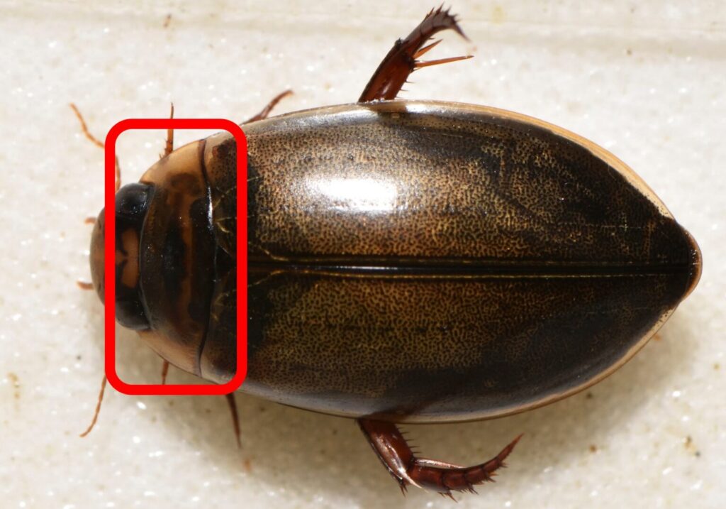 ヒメゲンゴロウは、ウスイロシマゲンゴロウにやや似ていますが、腹面が黒色であること(ウスイロシマゲンゴロウでは赤褐色)、眼の間に模様があること、胸部に細い楕円状の黒い模様があることから区別できます。全国的な普通種で、筑後川流域ではやや水温の低い中山間地の水田地帯では普通にみられます。