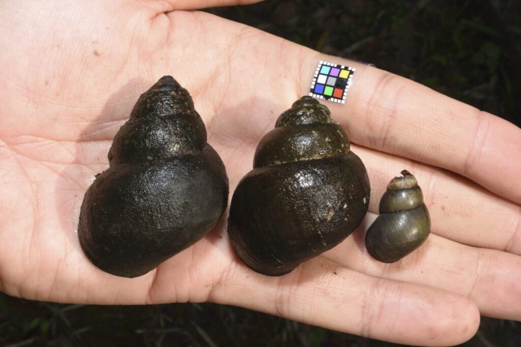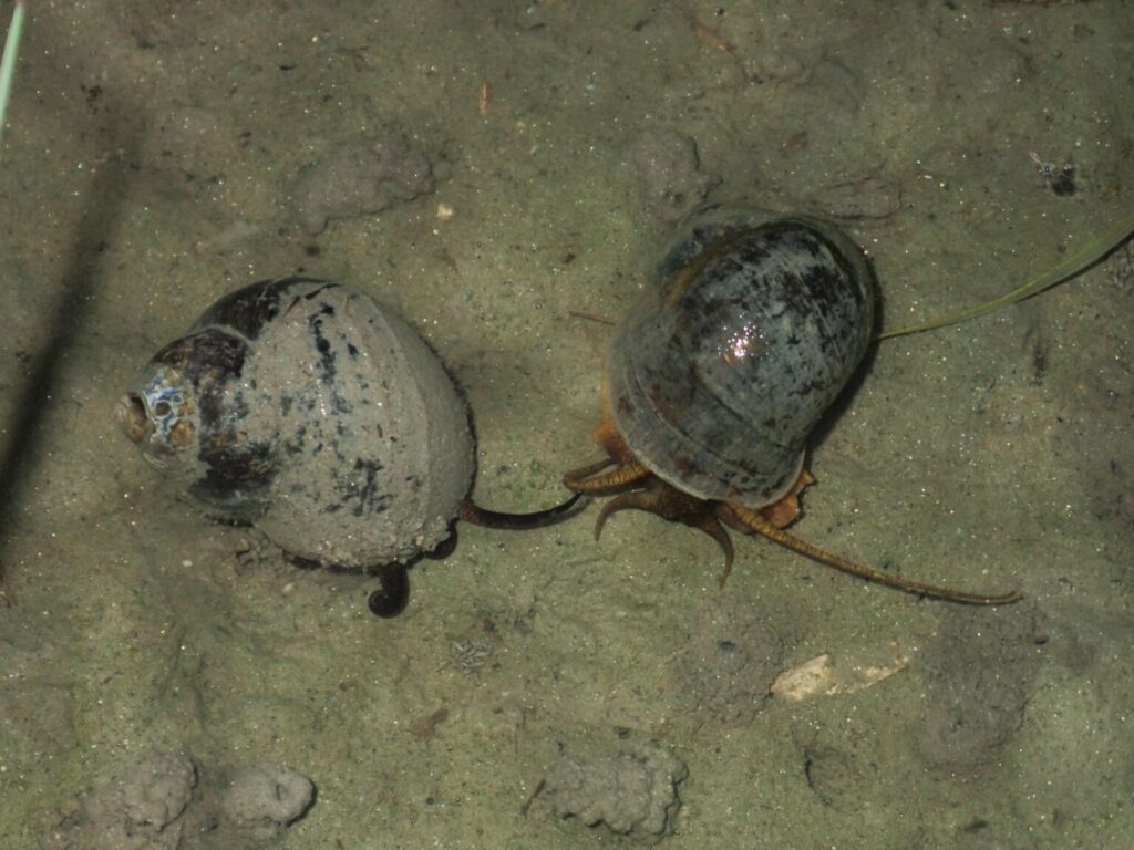 マルタニシは同じく在来種であるオオタニシやヒメタニシとも似ています。オオタニシは、九州では水田や水路などには生息せず、ため池などの水深のあるやや水が冷たい止水域に生息します。秋月地域にはおそらく分布しません。全体が尖っており、別名「カクタニシ」とも呼ばれます。名前のとおり、成長するとかなり大きくなります。一方で、ヒメタニシはコンクリートの水路などでも普通にみられます。本種はオオタニシやマルタニシよりも細長く、とがったような印象です。名前のとおり成長してもあまり大きくなりません。