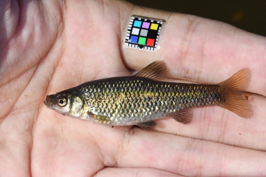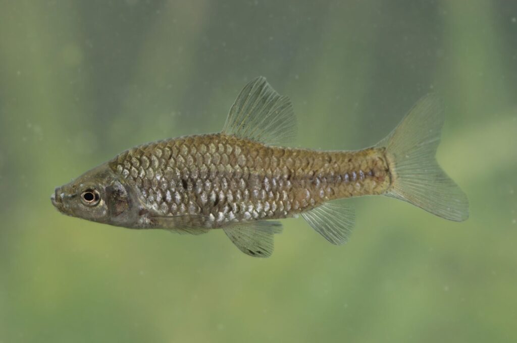 黒い婚姻色を呈するモツゴのオス(左上の稚魚はミナミメダカ)(佐賀県産)